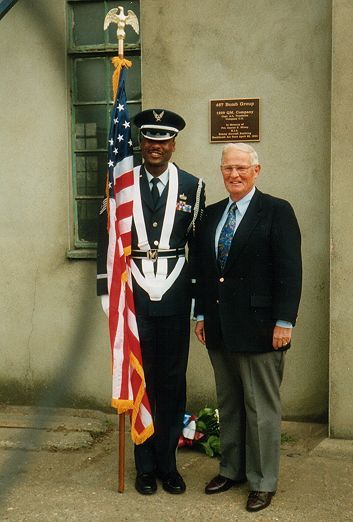 of Dan Miney Memorial Plaque 96 Al Touchette, former Commanding Officer of the 1229th Quartermaster Company, at the dedication of the Memorial Plaque to Pvt. Dan Miney. The ceremony took place on the anniversary of the loss of Dan Miney who was assigned to the 1229th and killed during the enemy intruder air raid on the base on the evening of 22nd April 44. See Casualties page. The Plaque can be seen on the wall of the former Quartermaster offices building located on the former Tech. site on the base. |