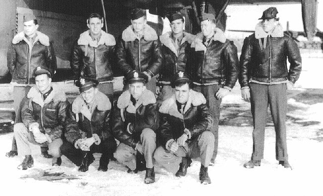 Left to right standing: Albert Gross, William Donnelly, Richard Borton, Houston Carlisle, Raymond Barnes, Calvin Jensen Bottom: Alford Robinson, Ralph Anderson, Michael Woloszyn, Charles Russell Photo taken at Wendover during initial training. Upon arrival at Rackheath copilot Alford Robinson was given his own crew and replaced by Lt. Harold Chilver. The Russell crew completed missions on the 11th August 44 but Lt. Chilver was killed 7th August 44 when returning on his second mission with his own crew, crashing close to Rackheath. See Casualties. For the Russell crew experiences see Veteran's Recollections at Library Shelf Three. |