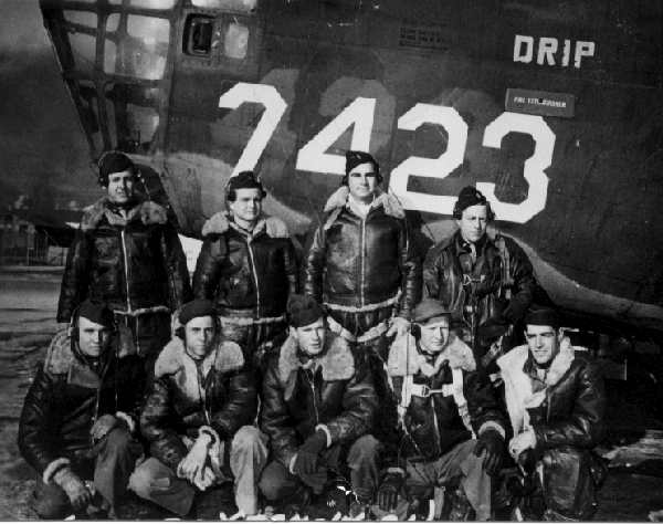Kenneth Driscoll Crew#7 at Wendover Left to right standing: Kenneth L. Driscoll, Edward D. Halpin, Harold Pantis, Joseph E Fox JR. Bottom: George H. Brannan, Unknown, Robert Brink, James W. Wright, Blair Henry. The Ken Driscoll crew had the distinction of leading the 467th with Col. Shower as command pilot on the Group's first combat mission on 10th April 44 to Bourges, France. Harold Pantis (Navigator) was taken POW, George Brannan and Richard Creighton (Gunners) were KIA when flying as replacements with the Harrison crew (Crew#18) on the Brunswick mission of 8th May 44. The crew were assigned to the 801st BG(P) on May 10th 44 upon the 788th's transfer to night time special operations. |