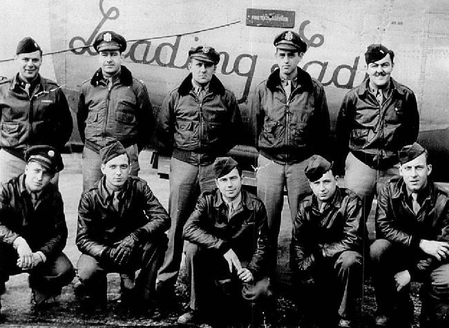 Crew#53 Left to right standing: Morton Deutsch, Arthur Garner, Daniel Wright, John Shetlar, Kenneth Penoyer Bottom: John Sawyer, Robert Arndt, Charles Quick, Rex Sedwick, James Ogilvie Lt. Garner took over much the same as the original Richard Campbell crew which now included several officers from other original 790th squadron crews. Garner later transferred to the 791st squadron in October 44 when it is believed the majority of the pictured crew had now completed their missions. |
