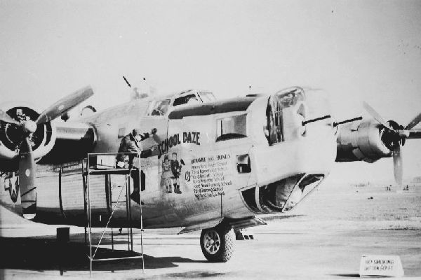 B24L 44-50250 "School Daze" 791st B.S. This later "L" model first flew combat toward the close of hostilities in late March 45. Picture shows ground personnel replenishing the original artwork after additional armour-plating obscured part of the name. See "Nose Art" for a closer look at this example. |